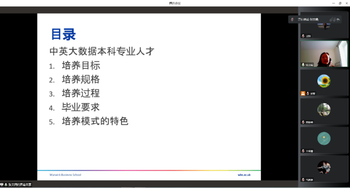 本网讯(经济学院 田玥)为了解英国高校大数据分析人才培养模式,进一步完善我校大数据管理与应用专业人才培养方案,为我校培养高素质复合应用型人才打好基础,经济学院于2022年12月16日19:30—21:00举办“海外名师”项目系列交流研讨会——中英大数据分析人才培养模式研讨会,特邀英国华威大学商学院张文娟博士开展讲座,采用腾讯会议以面对面直播的形式进行研讨。